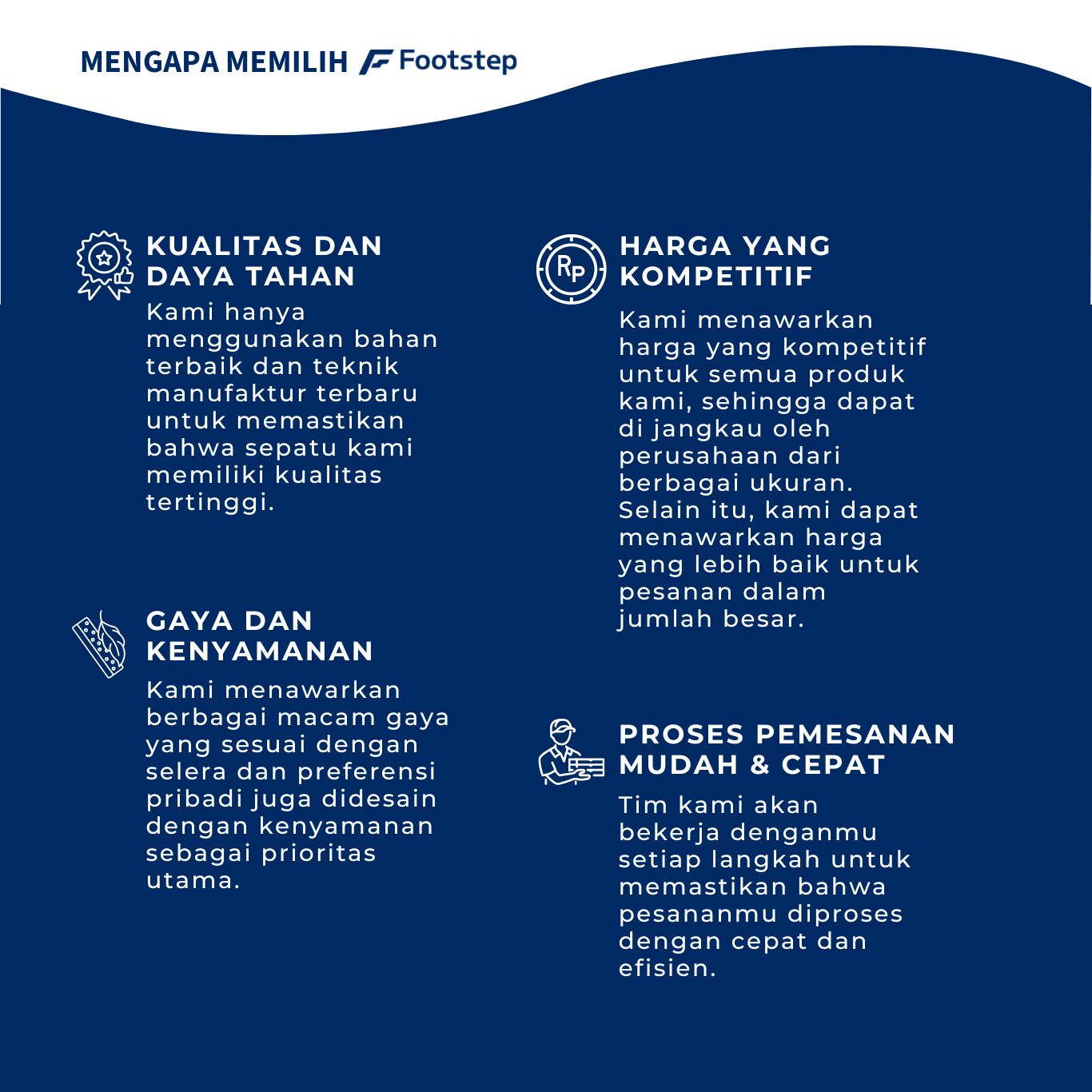 Untuk produk non-customized (menggunakan produk yang sudah tersedia di Footstep) memakan waktu sekitar 14 hari, apabila produk customized (ditambahkan aksen sederhana seperti logo atau menggunakan warna lain diluar warna default yang kami gunakan) memakan waktu s/d 30 hari. Apabila ada proses RnD yang harus dilakukan bisa memakan +30 hari (eksplorasi desain). Hal ini pun tetap tergantung pada kuantitas dan jenis produk yang akan diproduksi.