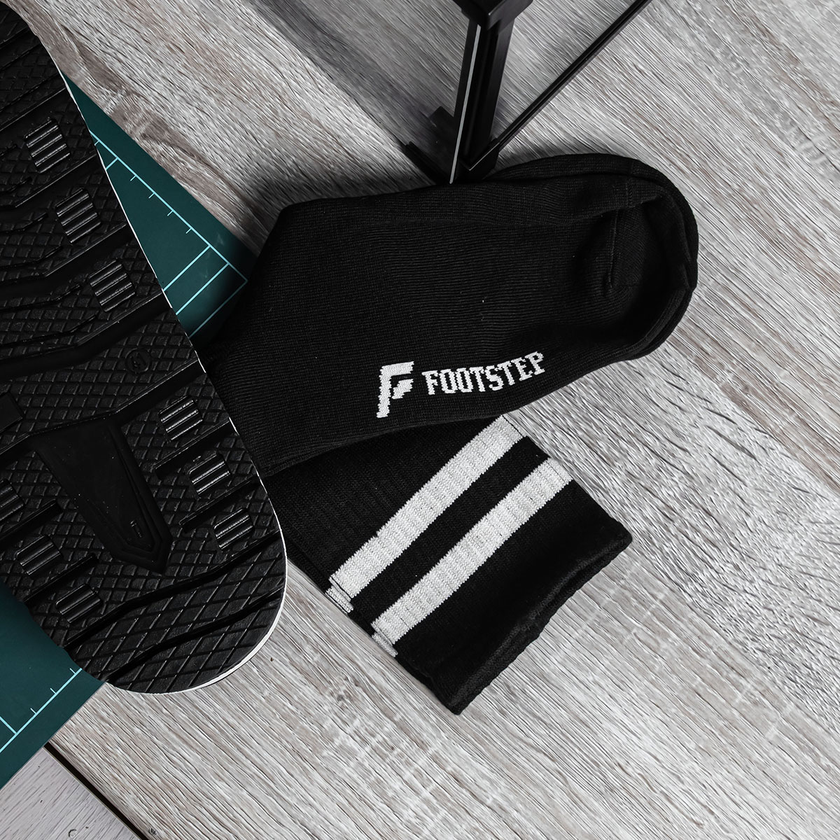 Motif : Aksen garis minimalis dengan signature logo Footstep